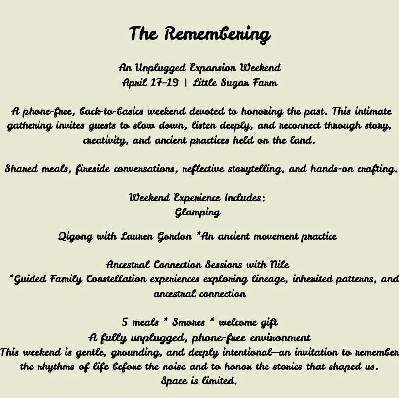 The Remembering: Before the Noise Friday, April 17, 2026 5:00 PM Sunday, April 19, 2026 12:00 PM Little Sugar Farm - Glamping & Gathering 552 Slinkard Road Pineville, MO, 64856 United States (map) Google Calendar ICS Purchase a Day passBook a single occupancy Safari tentBook a double occupancy Safari tentBook a shared Bell tent